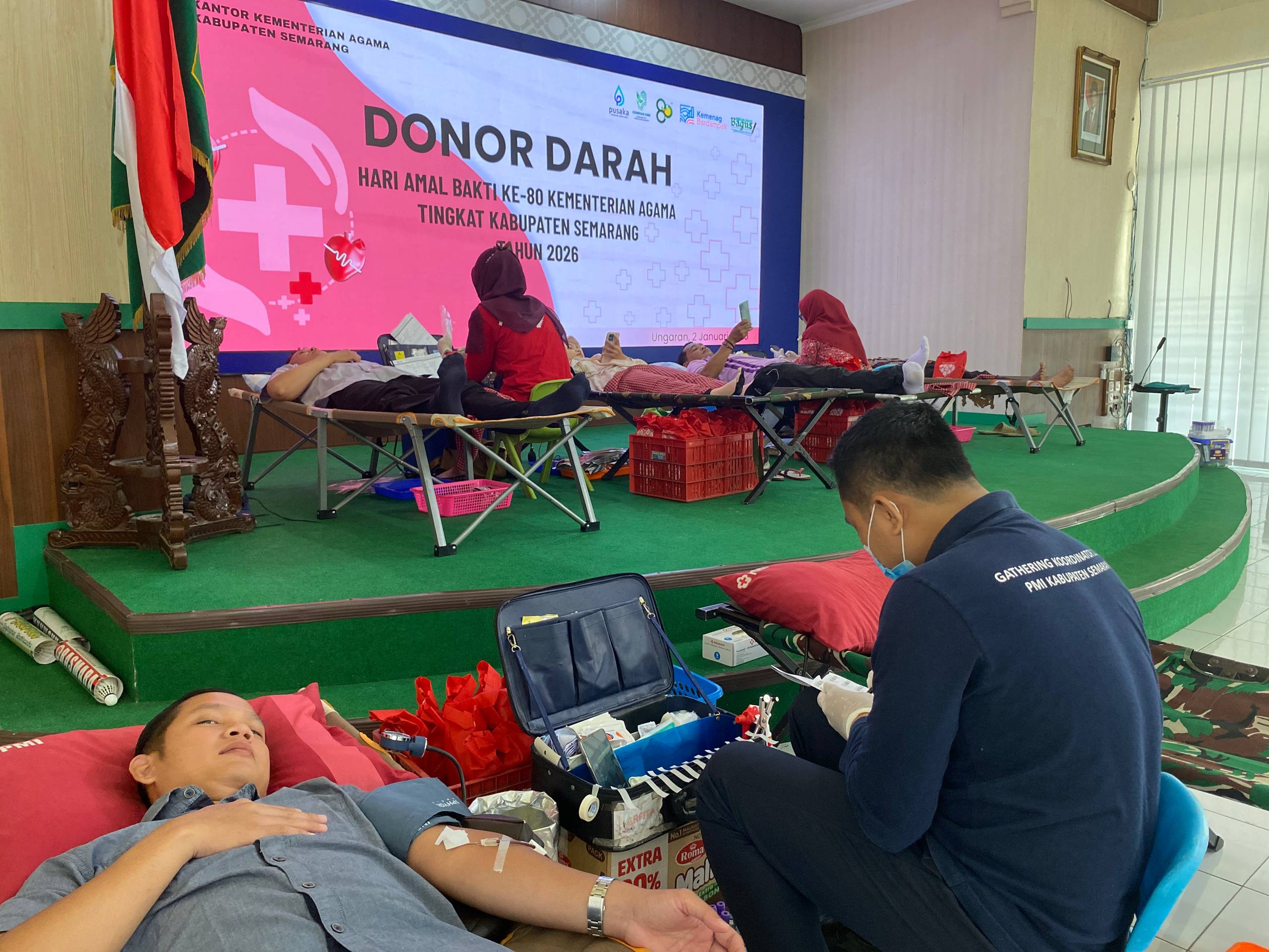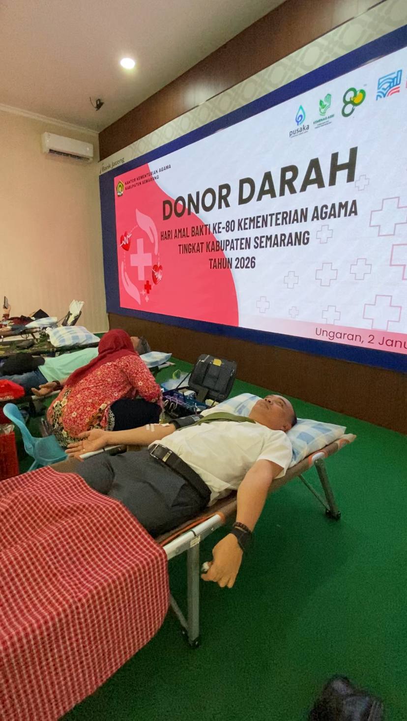 Kantor Kementerian Agama Kabupaten Semarang menggelar kegiatan donor darah dalam rangka peringatan Hari Amal Bakti (HAB) ke-80 Kementerian Agama RI, Jumat (2/1/2026). Kegiatan berlangsung di Aula Kankemenag Kabupaten Semarang dan bekerja sama dengan Palang Merah Indonesia (PMI) Kabupaten Semarang.